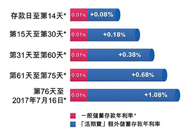 凡即日起至2017年4月30日內前往工銀亞洲任何分行,登記開立「活期寶」賬戶並存入低至港幣5萬元的新資金,整筆港元儲蓄存款由存入首日開始至2017年7月16日,即可獲享儲蓄存款年利率高達1.09%**,利息更逐日計算,較坊間一般儲蓄賬戶的利息為高: