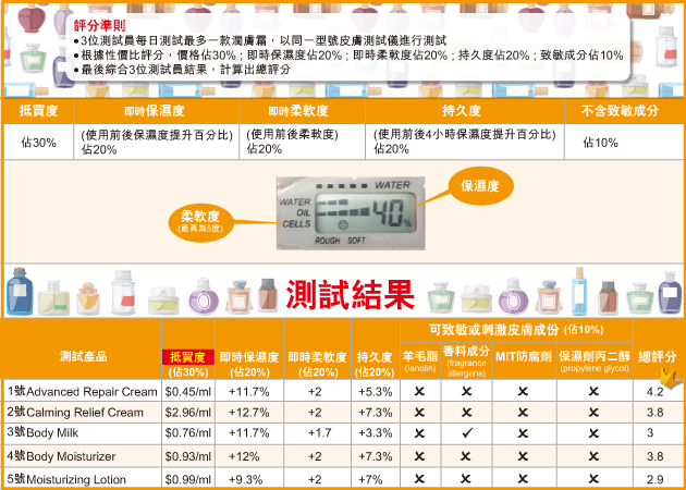小編今次就搵左坊間六種比較出名、唔同質地嘅潤膚霜,就住產品嘅抵買度、保濕度、柔軟度、持久度等做測試,當然都要比較埋每個產品所含嘅致敏成分啦。為左確保準確性,我地搵左三個測試員,每日試一種潤膚霜,並嚴格跟足步驟洗手,再用化妝棉印乾皮膚,確保皮膚表面無任何其他物質,係搽左潤膚霜之後,即時記錄低保濕度、油性等狀態,隔4個鐘後再用儀器測試持久度。